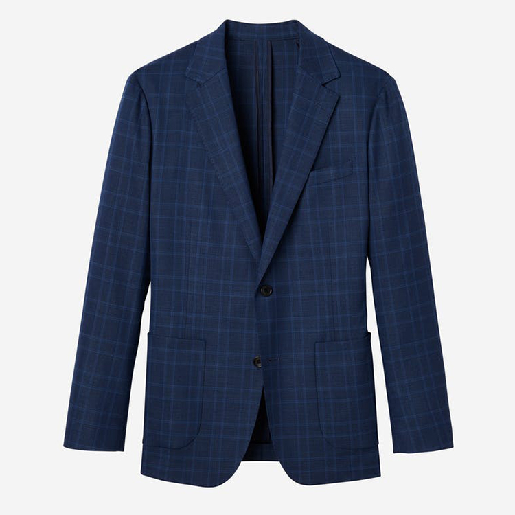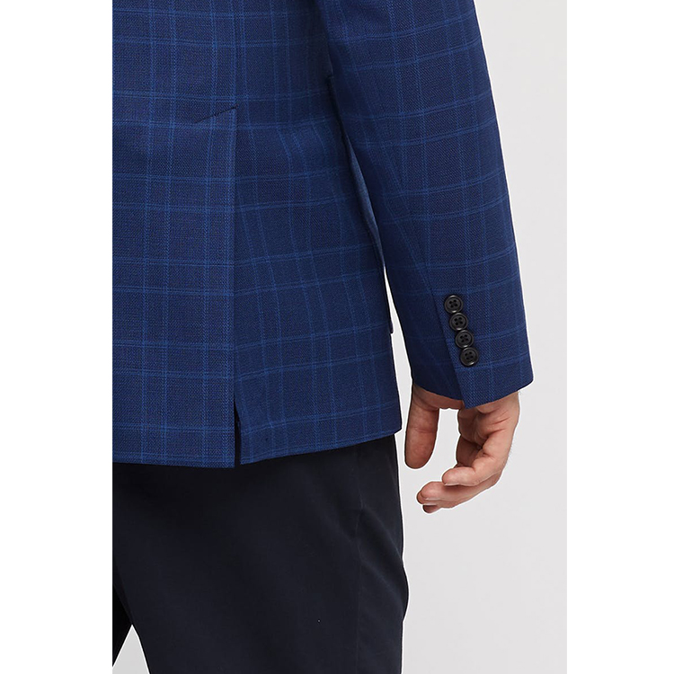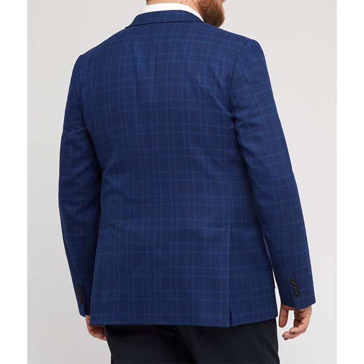 Blazer 1. Lapel:Notch lapel 2. Pocket:patch pockets 3. Closing:Single-breasted, 2 buttons 4. Sleeve buttons:4 buttons folded 5. Breast Pocket:straight shape 6. Back vent: double vents 7. Lining:polyester 8. Characteristic:casual business style, classic royal blue check, well cutted